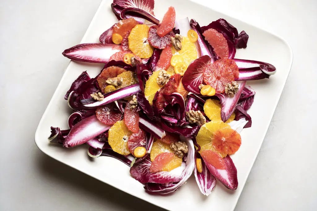 Chicory hearts, stripped and bittered, served with blood oranges, walnuts, Bleu d’Auvergne, and a sherry vinaigrette.